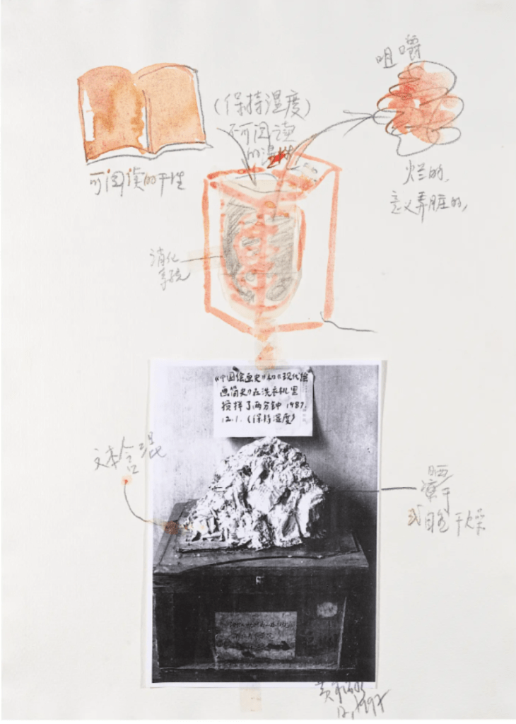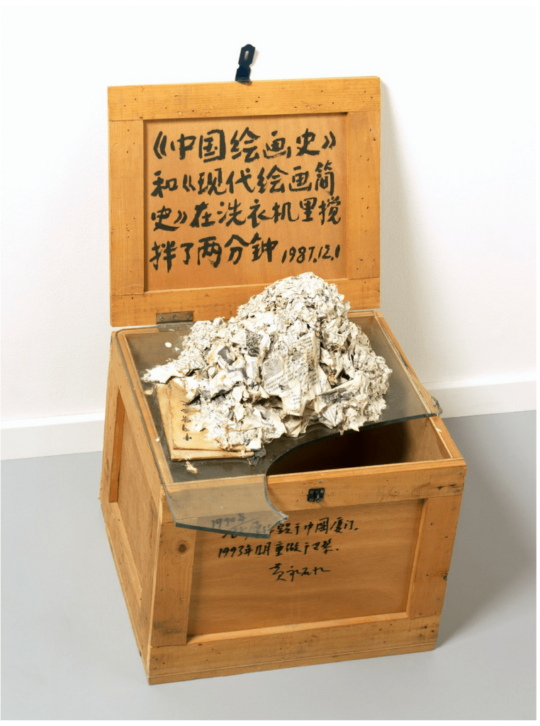 On the first of December in 1987, Huang took two books of art history, Wang Bomin’s The History of Chinese Painting (1982) and Herbert Read’s A Concise History of Modern Painting (1959), and put them into a washing machine on a two-minute cycle. The resulting mass of paper pulp would then be presented on a sheet of broken glass atop a wooden box, as The History of Chinese Painting and the History of Modern Western Art Washed in the Washing Machine for Two Minutes (1987) (hereafter “Two Minutes”). First shown at the 1989 China/Avant-Garde exhibition in Beijing, after the death of Mao Ze Dong and the fall of the Gang of Four, the dialectical logics of Chan and Dada converged within Two Minutes.