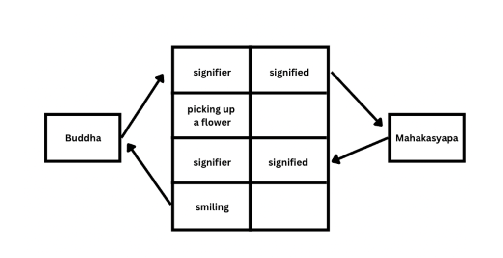 From the anthology, Huang draws out a koan (paradoxical anecdote, riddle of sorts or simply a “case”) where the Buddha is holding a sermon on the peak of Vulture Mountain with an assembly of monks. Instead instead of speaking at the sermon, he picks up a flower and shows it to his students.(9) In response to this lesson, the monks remain silent in bemusement except Mahakasyapa who smiles at the Buddha, to which the master responds: